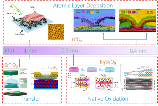 国际器件与系统路线图(IRDS)要求3纳米及以后技术节点的等效氧化层厚度(EOT)为1至0.9纳米。2D材料的无悬挂键表面使得前体难以附着在2D材料上,导致介电层表面粗糙并形成针孔,栅控能力下降。如图5所示,近期的实验中使用晶种层修饰表面的原子层沉积技术、转移沟道技术、氧化原生介电层技术等,将EOT成功减薄至亚1纳米,并实现了最低0.4纳米的记录。