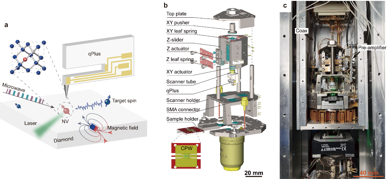 图1 (a):扫描量子传感显微系统原理图:融合了qPlus原子力传感器、NV色心以及表征和调控NV量子态所需的激光、磁场和微波序列。(b):高分辨扫描量子传感显微镜核心部件----扫描探头的3D模型。(c):高分辨扫描量子传感显微镜核心部件----扫描探头的实物照片。