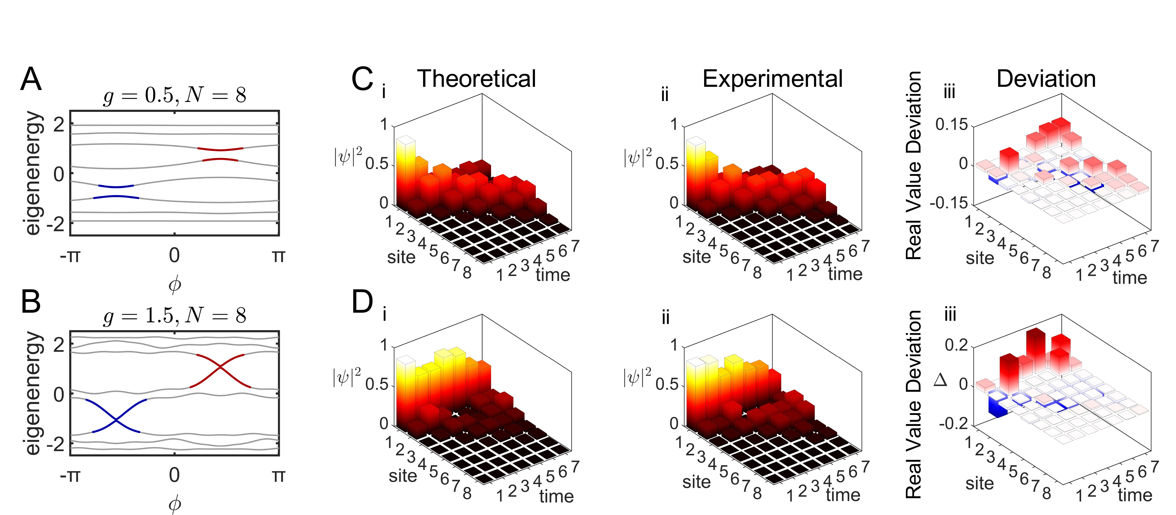 图3.一维AAH拓扑绝缘体量子态演化的模拟结果。(A-B)两种拓扑相下以起始相位作为合成维度的准能带。(C-D)两种拓扑相下量子模拟的理论结果和实验测量结果。