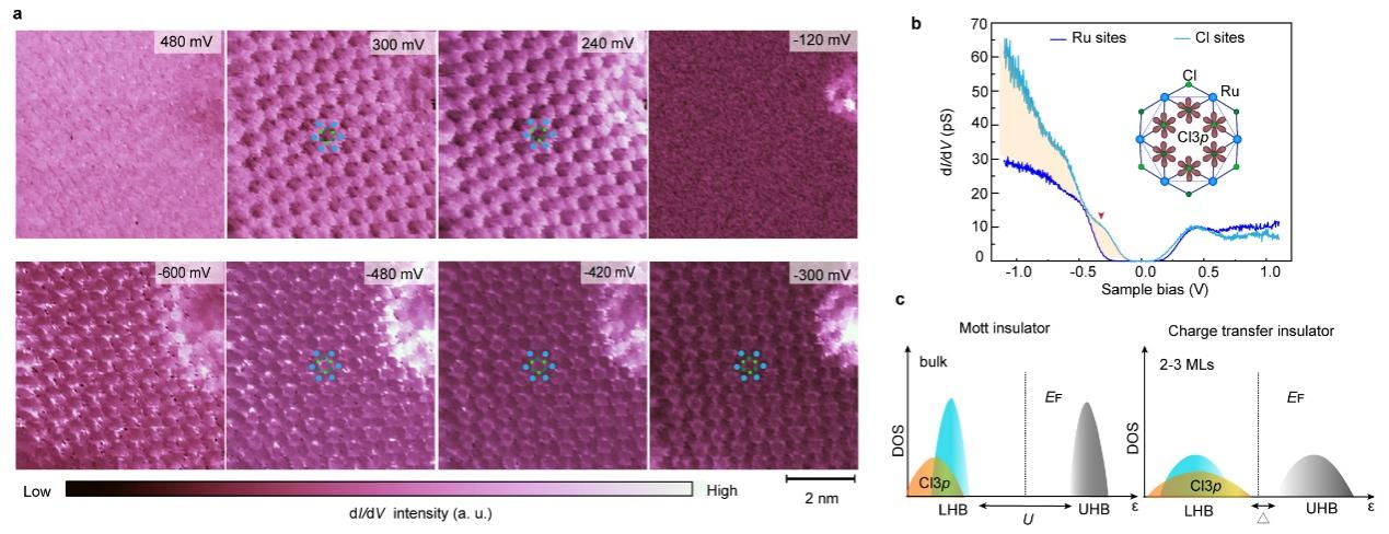 图1.异质结结构中α-RuCl3薄膜的非常规Mott相变(a)单层α-RuCl3晶体结构;(b)异质结的STM图像;(c)和(d)dI/dV谱线测量中的非常规Mott相变。