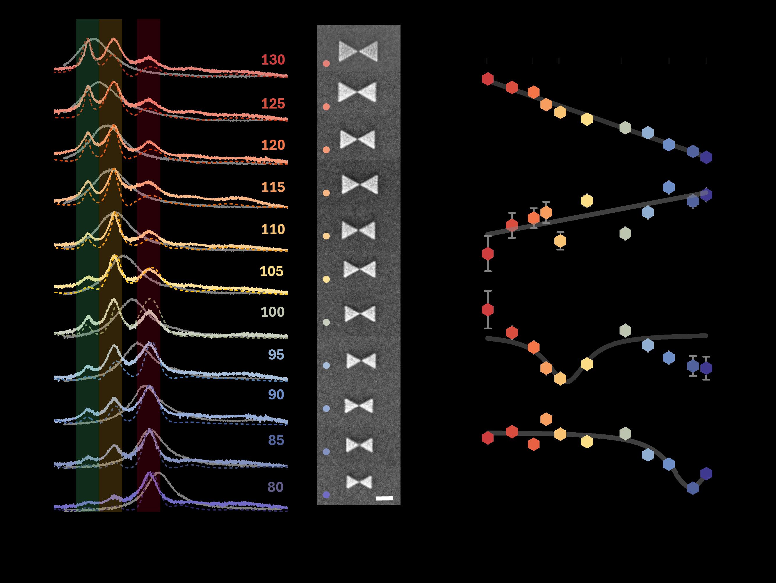 研究团队通过不断优化微纳加工技术,制备出了间隙稳定在约10 nm左右的bowtie型纳米腔,为实现超小模式体积光腔提供了坚实基础。通过调整一维光子晶体的缺陷层厚度,实现了BSW模式与等离激元间隙模式、WSe₂单层中的激子间的能量匹配。在实验中,通过调整bowtie纳腔的结构尺寸,可以对等离激元模式进行有效地调谐。如图2中的暗场散射光谱可见,布洛赫表面波的引入显著降低了等离激元模式的线宽,从而抑制了等离激元损耗,降低了强耦合的临界条件。