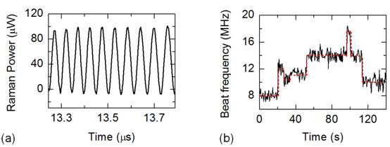 | 图2:(a),微腔拉曼激光的拍频信号;(b),拍频信号随时间的变化,拍频的台阶变化表示单个20 nm尺度颗粒的吸附。