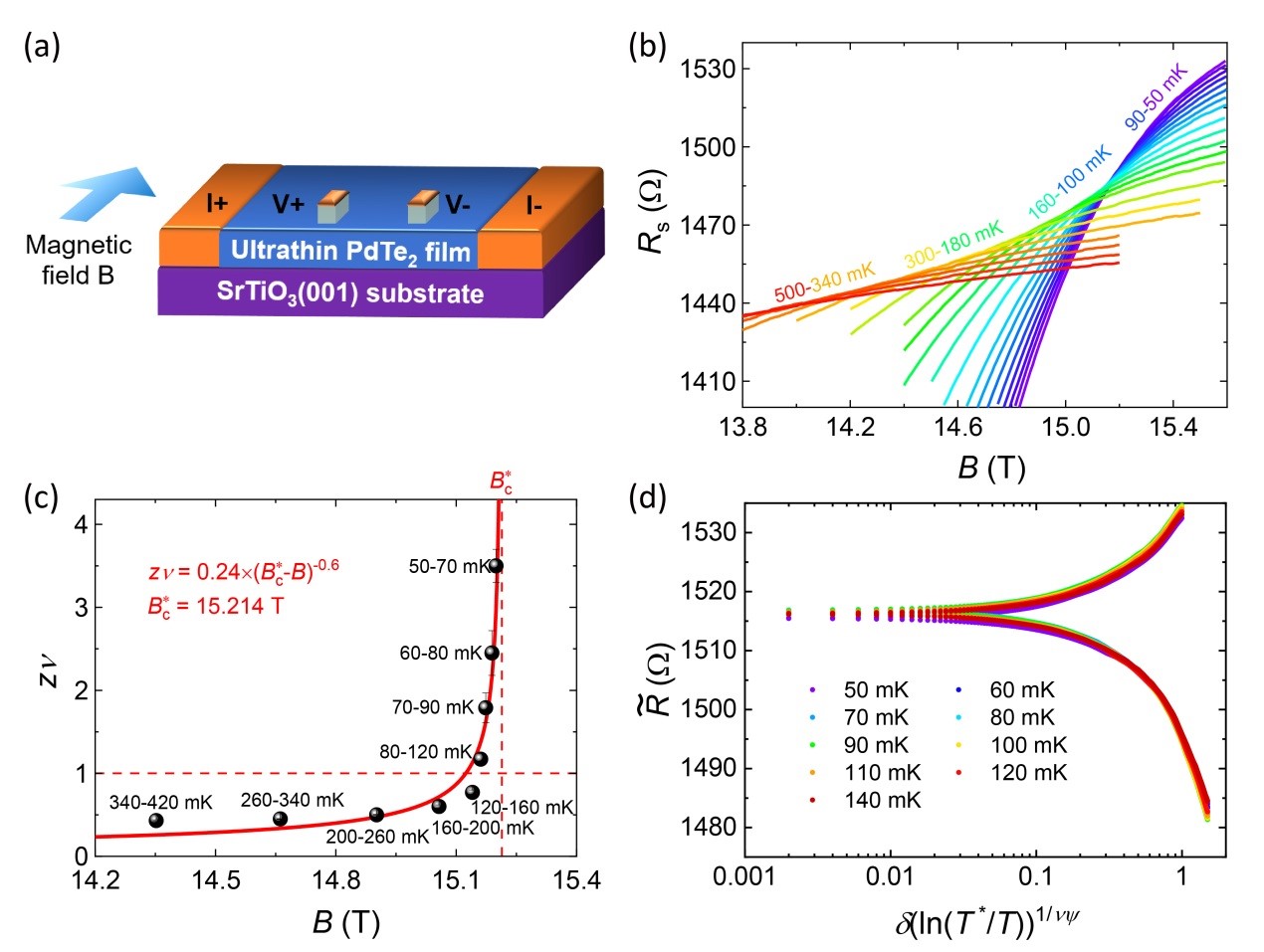 最近,王健教授课题组与谢心澄院士、林熙研究员,及中国人民大学刘易副研究员、北京师范大学刘海文研究员、清华大学薛其坤院士和王立莉副研究员、中国石油大学(北京)邢颖副教授等合作,在分子束外延生长的高质量晶态二碲化钯(PdTe2)超导薄膜中观测到了平行磁场下的量子格里菲斯奇异性。联合研究团队系统地实验研究了四个原胞层厚(约2 nm)的PdTe2薄膜的超导-金属相变行为,在垂直和平行磁场下均观测到不同温度下的磁阻曲线交叠于一个区域。对上述实验结果进行标度理论分析,表明四层PdTe2薄膜在垂直和平行磁场下的临界指数均随着磁场的增加而增加,直至发散——这是量子格里菲斯奇异性的典型特征。理论认为,量子格里菲斯相的形成伴随着从磁通格子到磁通玻璃相的转变;而在平行磁场下,磁通无法形成,因此平行场量子格里菲斯奇异性的发现揭示了一种与磁通无关的全新的量子相变物理机制。当薄膜厚度增加到六层时,量子格里菲斯奇异性在垂直磁场下已经消失,但在平行磁场下依然存在。六层PdTe2薄膜在不同的磁场方向下表现出的不同量子相变行为,进一步证明了垂直和平行磁场下量子格里菲斯奇异性的微观过程存在差异。