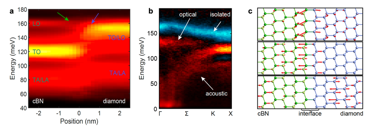 近日,高鹏课题组利用四维电子能量损失谱学技术,首次在晶体异质结界面处观测到界面声子的存在,并测量了其空间分布、局域态密度和色散关系。在大会聚角下,实验空间分辨率可达原子级,从而实现声子局域态密度的原子级测量,直接观测到局域在界面附近的增强和减弱的声子模式;在中等会聚角下,可同时达到1.5 nm以内的空间分辨率和金刚石1/4第一布里渊区边长的动量分辨率,从而首次实现了这些局域声子模式的色散关系测量。他们以立方氮化硼-金刚石界面为例,系统地展示了实验测量结果。根据理论计算,测得的金刚石氮化硼界面声子模式不仅对界面热导有显著贡献,也通过电声相互作用直接影响界面二维电子气的迁移率。这一成果有望未来在界面热传导、界面超导机理和拓扑声子学等领域中发挥重要作用。