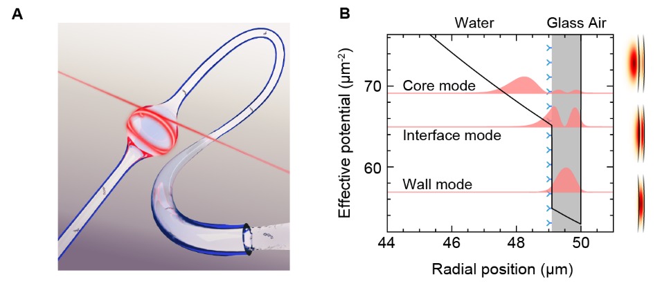 图1 (A)微泡腔传感示意图;(B)微泡腔中的壁内模式、界面模式和液芯模式的典型电磁场分布,界面模式的电磁场峰值恰好位于内部传感表面处