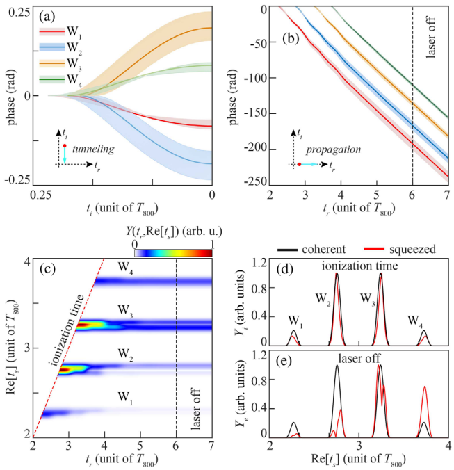 通过鞍点近似方法,研究团队发现压缩态光场的量子涨落导致隧穿电子波包的相位随着光场演化存在不确定度[图2(a)和图2(b)],它进一步影响着不同时刻出射电子的相干性,并且调制了它们之间的干涉结构。研究团队还发现光电子积累的相位不确定度会导致电离率随着光电子在激光场中的运动而降低。如图2(c)所示,在一个激光脉冲包络内,较早电离的电子波包(图2(c)中的W1),其电离率的衰减程度明显大于更晚电离的电子波包(图2(c)中的W4)。这是因为较晚电离的电子波包在压缩光场中积累的相位不确定度小。因此末态的电子电离率受到了不同程度的调制[图2(e)]。最终,光电子动量分布体现为较晚电离的电子波包W3和电子波包W4的周期内干涉。