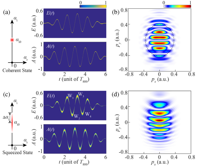 图1 (a)相干光的相空间分布(左),电场和矢势(中),以及电离得到的光电子动量分布(右);(b)压缩光的相空间分布(左),电场和矢势(中),以及电离得到的光电子动量分布(右)。