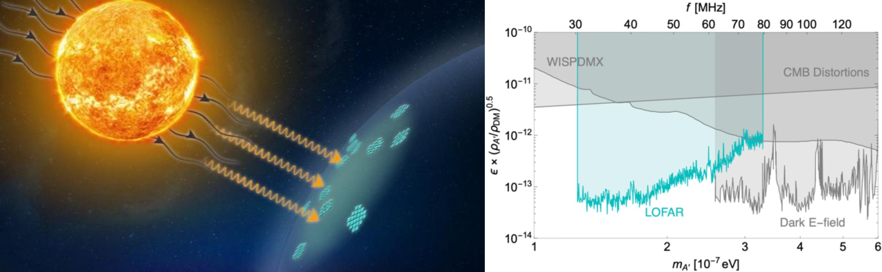 图例:(左)示意图;(右) 来自LOFAR太阳观测数据的暗光子暗物质耦合强度限制。