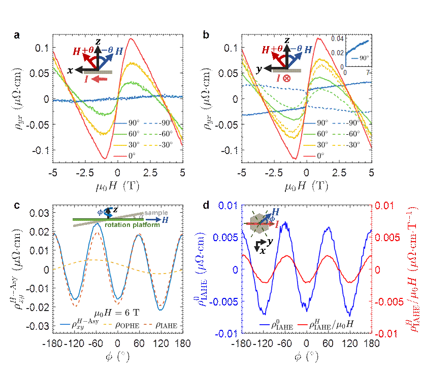 图1 a,b霍尔效应在磁场/磁化打破镜面对称性时出现,面内反常霍尔效应(插图)由与磁化相关的跳变(斜散射机制主导)和与磁场相关的线性依赖(磁非线性反常霍尔效应)两部分构成。c,d面内反常霍尔效应呈现120°周期性,区别于正常霍尔效应的行为,同时符合晶体对称性的要求。