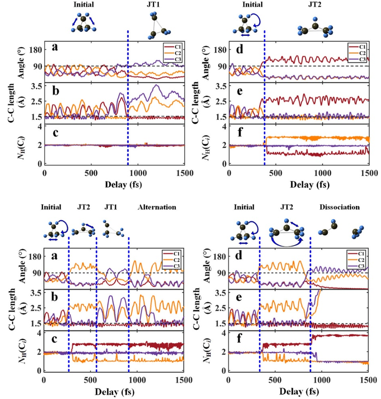 如图2所示,对于最外层电子电离后的环丙烷离子,具有较高对称性的初始结构为势能曲面上的一个鞍点,这个鞍点周围存在两个对称性更低、能量也更低的极小值点。为了形成能量更低的结构,电离后的环丙烷离子会通过电子和分子振动自由度的耦合,自发地经历对称性破缺过程,分子结构会从正三角形结构变为等腰锐角三角形或等腰钝角三角形结构。不同的Jahn-Teller形变过程会诱导不同质子转移和异构化过程,最后会演化为不同的库伦爆炸通道。Jahn-Teller演化过程的动力学信息可以通过时间分辨离子释放动能获得。分子动力学模拟结果显示,当环丙烷离子通过Jahn-Teller过程演化为等腰锐角三角形结构时,分子内质子不会发生迁移;而通过另一种Jahn-Teller过程,则演化为等腰钝角三角形结构,将会驱动质子从一个碳原子转移到另一个碳原子上。在第一次质子转移完成后,环丙烷离子还有可能经历后续结构演化,发生二次质子转移过程,从而形成多个质子转移的解离通道。图3给出了C3H6+离子的Jahn-Teller形变和质子转移的演化动力学过程。