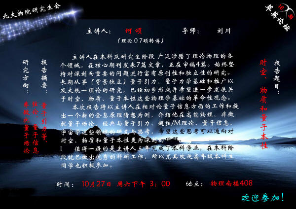 报告人:何颂(07级理论硕转博;导师:刘川)研究方向:相对论Hartree-Fock理论及其应用报告题目:时间,物质和量子本性(Spacetime, Matters and Quantum)沙龙时间:2007年10月27日(周六)下午3:00-5:00沙龙地点:物理南楼408报告摘要:报告人将以他在相对论量子信息方面的工作和提出一个新的全息原理猜想为例,介绍他在高能物理、非微扰量子场论、经典与量子引力、超弦/M理论、量子信息、宇宙学这些领域的研究与思考,希望这些思考可以通向对时空、物质和量子本性更为深刻的理解。报告人简介:何颂同学是理论物理05级硕士,07级硕转博,本科毕业于mg4355线路检测官网,2002-2005年完成本科学习。本科阶段开始接触科研工作,到目前为止,已经广泛涉猎了理论物理的各个领域,在核心期刊发表7篇文章,正在审稿4篇。始终坚持对深刻而重要的问题进行富有原创性和独立性的研究。长期从事(背景独立)量子引力、量子力学基础和推广以及大统一理论的研究,已经初步形成并希望进一步发展关于时空、物质、量子本性这些物理学基础的革命性观念。