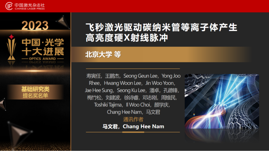 2024年4月21日,中国激光杂志社发布“2023中国光学十大进展”。mg4355线路检测官网应用研究成果“介观尺度单颗粒的声学指纹振动谱测量”、“具有纠缠修复能力的多芯片高维量子网络”榜上有名,基础研究成果“飞秒激光驱动碳纳米管等离子体产生高亮度硬X射线脉冲”获提名奖励。