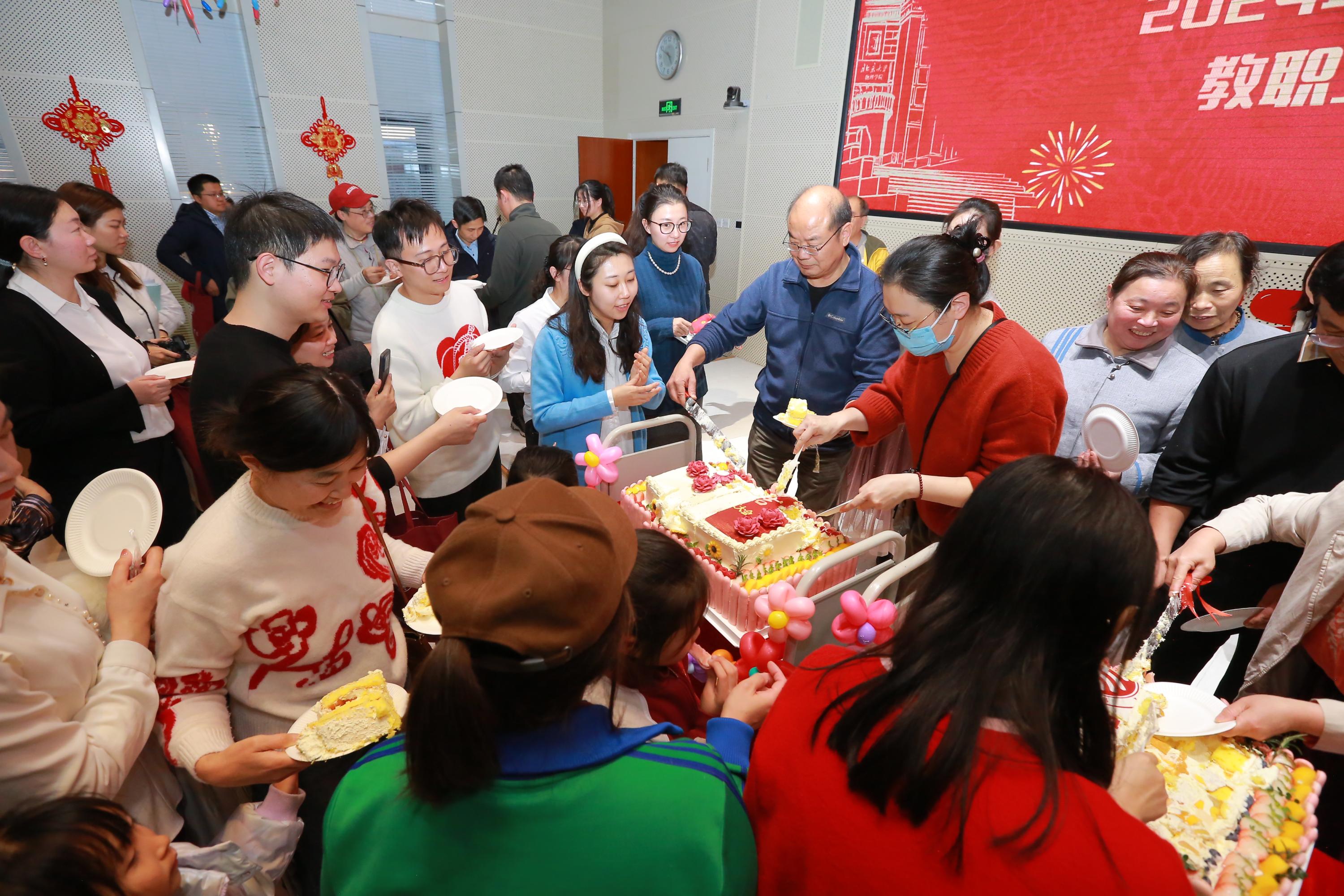 在联欢最后的特别环节,即将迎来本命年的老师们在全场掌声和祝福中来到台前,携手分切生日蛋糕,与全体参会人员共同庆祝这一难忘时刻,将整个活动推向高潮,全场洋溢着温暖与欢欣。