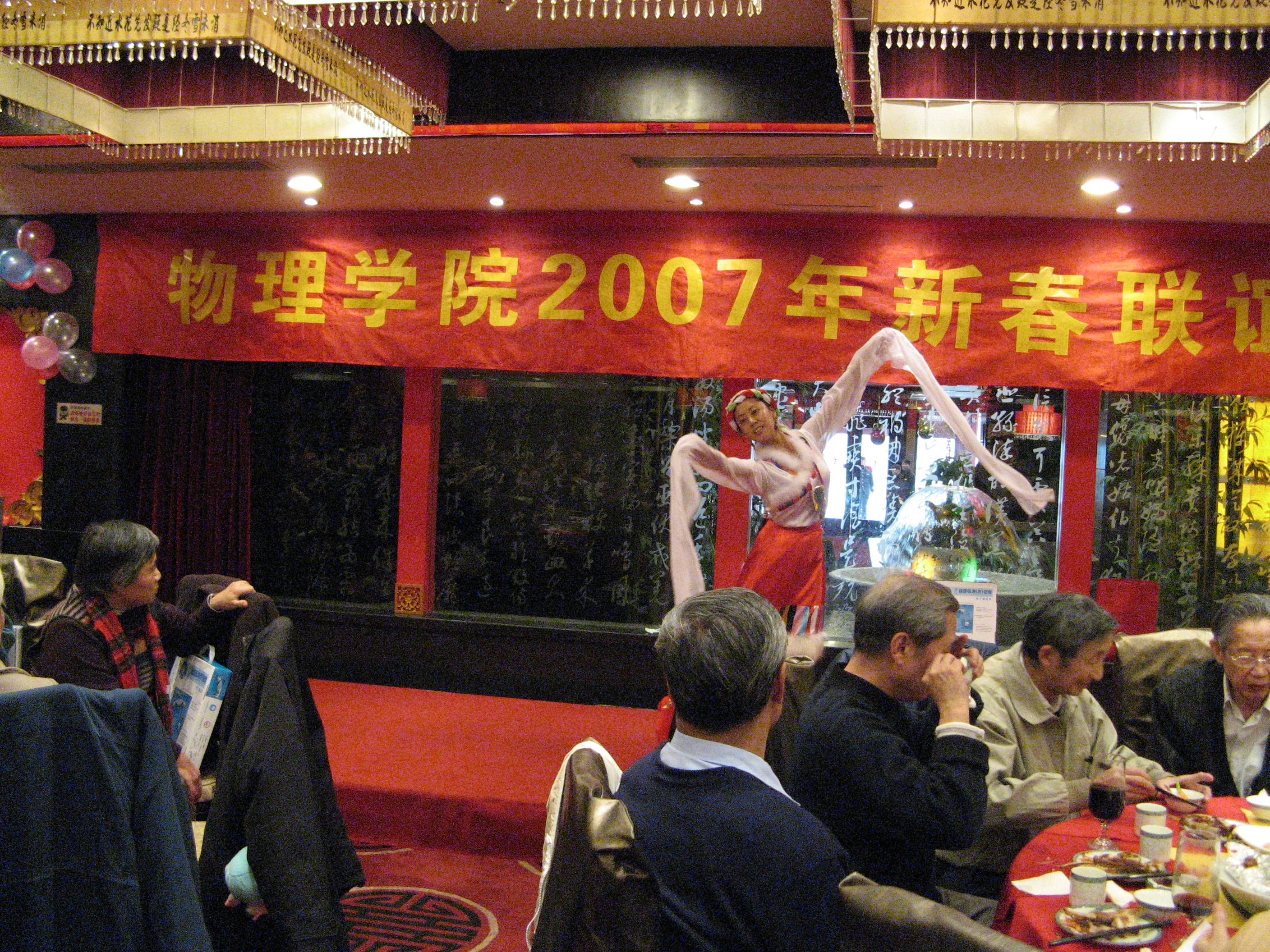 开始自由表演,大家一边品尝美味佳肴,一边自娱自乐。本是上海人的叶学敏教授兴致勃勃地唱了一段京剧“甘洒热血写春秋”,虽然,说不上字正腔圆,却也韵味十足;技物系孟杰教授没忘老传统,上台后先给大家拜了个早年,又献上了一首“花儿为什么这样红”着实勇气可嘉;最后蹦上台的是金猪本命年的俞大鹏教授,他演绎的经典歌曲“牧歌”,虽是耳熟能详,却很是让大家回忆逝去的光阴,歌唱毕,他的同桌给他献上一朵红玫瑰以资鼓励他精彩的才艺展示,这种别具一格又带点幽默感的和谐之美,立即得到周边各位的认同,大家都报以热烈的掌声。