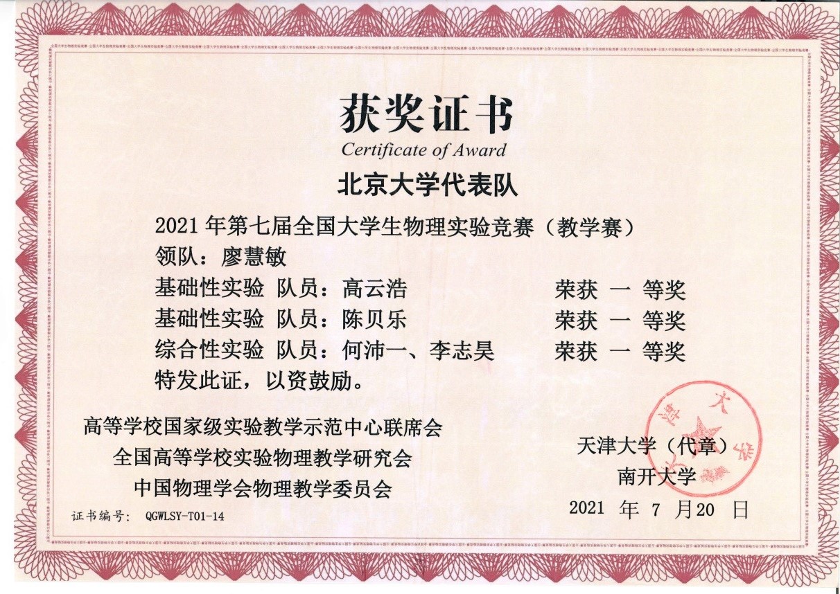 2021年7月18—21日,第七届全国大学生物理实验竞赛(Chinese Undergraduate Physics Experiment Competition, CUPEC)(教学赛)成功举办。由元培学院2019级本科生高云浩,mg4355线路检测官网2019级本科生陈贝乐、何沛一、李志昊组成的mg4355vip检测中心代表队获三项一等奖,其中,高云浩、陈贝乐分别获得基础性实验题(C)、基础性实验题(D)一等奖,何沛一、李志昊合作获得综合研究性实验题(C)一等奖。mg4355线路检测官网、基础物理国家级示范实验教学中心廖慧敏副教授担任领队,与李智教授和田广工程师共同组织带队参赛。