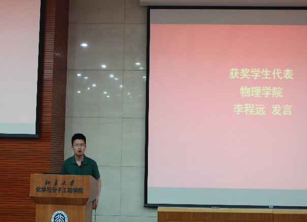 颁奖典礼首先由北大教育基金会胡俊老师进行致辞,胡老师简明而深情的回顾了“钟盛标物理教育基金”、“钟陈玉蘭基金”设立十余年来的历史,并精练的小结了捐赠人、获奖者、工作人员的三个“传承”关系;随后基金捐赠人钟赐贤先生对颁奖仪式进行了致辞,钟先生首先感谢了mg4355线路检测官网和化学学院对“mg4355vip检测中心钟盛标物理教育基金”及“mg4355vip检测中心钟陈玉蘭基金”重视。并勉励获奖选手再接再厉争取做出更大成绩。钟先生还表达了对祖国核能、高铁等高科技的自豪之情,并勉励在座学子们不断攀登科学高峰,为祖国科学事业多做贡献。在颁奖环节,化学学院副院长付雪峰特聘研究员和学院副院长王宇钢教授和分别致辞和宣读了本届获得钟盛标物理教育基金、钟陈玉蘭基金的获奖师生名单。钟赐贤夫妇以及学院党委书记陈晓林老师、副书记董晓华老师以及学院副院长王宇刚老师等嘉宾老师为选手颁发了获奖证书。颁奖仪式后,获奖教师代表化学学院卞祖强副教授、学院李程远同学分别发言,均对钟先生夫妇的善举表示感谢,并表示将不辜负厚望,继续努力,在科学的道路上不断探索前进。