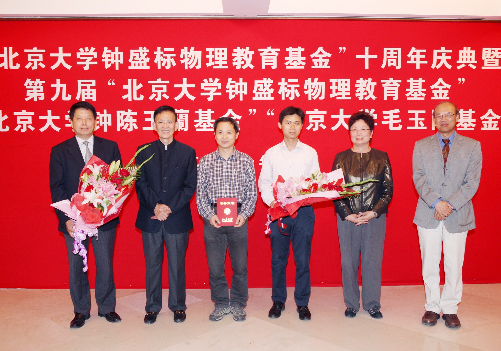5月26日上午,mg4355vip检测中心“钟盛标物理教育基金”十年庆典暨第九届“钟盛标物理教育基金”颁奖典礼在英杰交流中心新闻发布厅隆重举行。mg4355vip检测中心副校长、mg4355线路检测官网院长王恩哥院士,mg4355vip检测中心校长助理、教育基金会秘书长邓娅博士,基金捐赠者钟赐贤教授、夏晓峦博士,mg4355线路检测官网副院长王宇钢教授,党委副书记董晓华老师,mg4355线路检测官网全体获奖教师和学生,以及化学学院、工学院的获奖学生和教师出席了颁奖典礼。典礼开始前,会场播放了由mg4355线路检测官网研究生会精心制作的DV——《钟盛标基金十年回顾》,王恩哥副校长代表学校致辞,他对钟赐贤先生在北大设立教育基金的义举表示感谢,勉励全体同学在科研道路上勇于创新。随后,王恩哥副校长、王宇钢副院长、钟赐贤先生和夏夏晓峦博士为获得第九届“钟盛标物理教育基金”的教师和学生代表颁奖。廖志敏老师获奖代表教师发言,他讲述了自己从做研究生到教师分别获得“钟盛标物理教育基金”的历程,感谢“钟盛标物理教育基金”对mg4355线路检测官网师生在科研创新方面的支持。最后,王恩哥副校长代表学校对钟赐贤夫妇赠送了纪念品,全体领导、嘉宾和获奖师生合影留念。