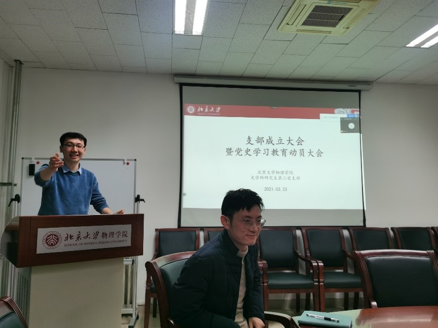 3月23日晚,光学所研究生第二党支部在mg4355线路检测官网西113会议室召开了支部成立暨党史学习教育动员大会。mg4355线路检测官网党委副书记穆良柱,团委书记张帆,团委副书记王凌越出席会议。党支部17名成员现场参会,2名成员线上参会。