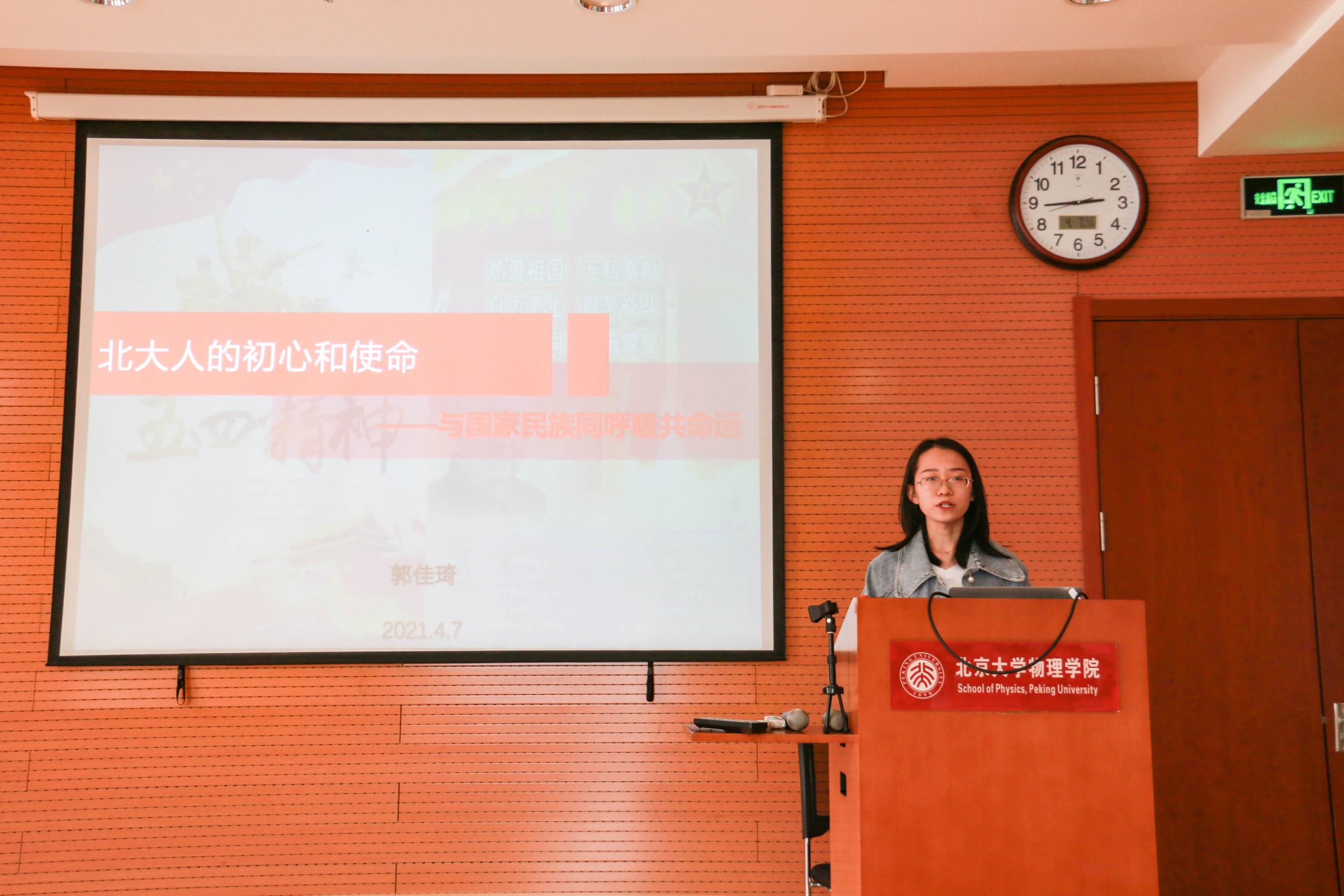 首先,郭佳琦同志向大家做了题为“北大人的初心和使命——与国家民族同呼吸命运”的主题报告,重点向大家介绍了党精神谱系中的五四精神和“两弹一星”精神,并结合mg4355vip检测中心的历史,带领大家回顾了北大传承的五四精神和“两弹一星”精神在不同历史时期的发展历程。mg4355vip检测中心是五四运动的策源地,在蔡元培、李大钊等北大师生的领导下,北大成为最早讲授马克思主义课程的大学,是新文化运动的中心以及马克思主义在中国的传播基地。五四精神在不同历史时期都发挥着重要作用,其内涵永远紧紧围绕着“爱国、进步、民主、科学”的精神内核。“两弹一星”精神代表着热爱祖国、无私奉献的科研工作精神,在物质技术条件极其恶劣的情况下,广大科研人员通过艰苦奋斗、大力协同,创造了非凡的科学奇迹。
