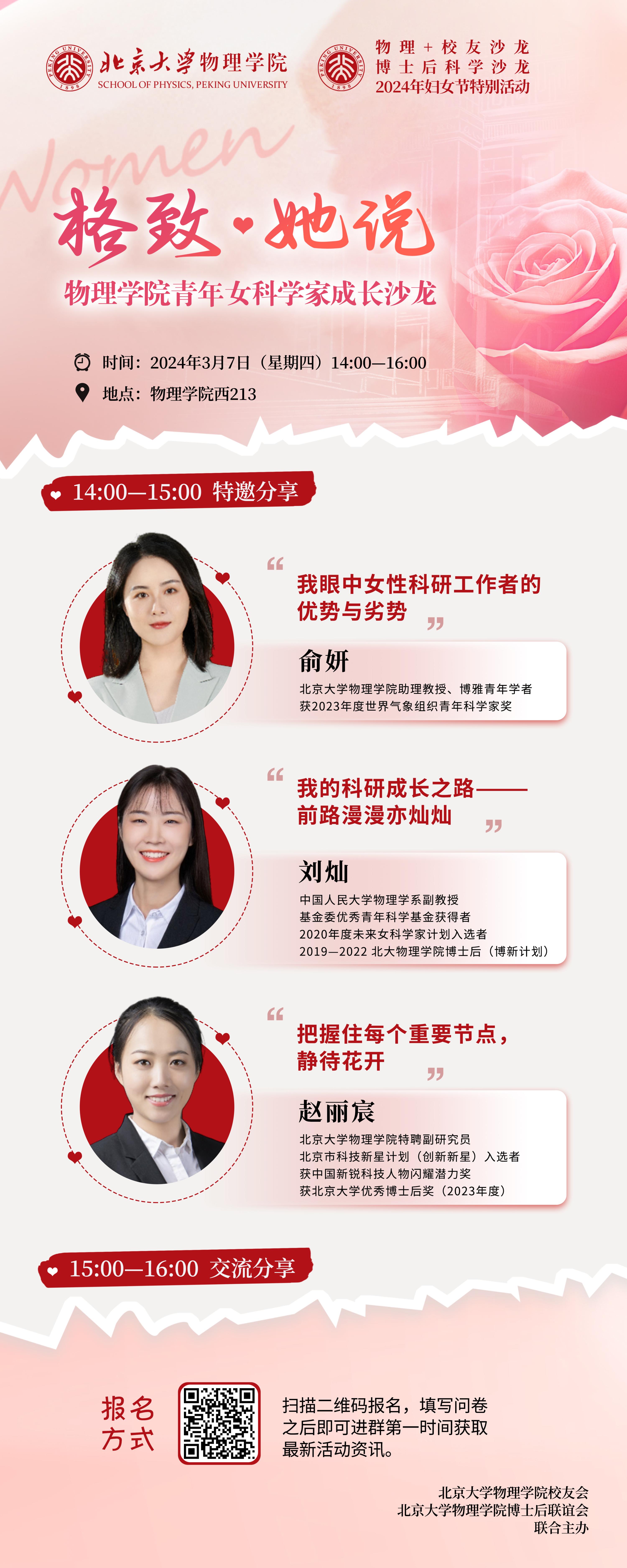 mg4355线路检测官网校友会和博士后联谊会联合举办首期“格致·她说”mg4355线路检测官网青年女科学家成长沙龙,旨在搭建开放、多元化的学术交流和发展平台,共同关注和支持青年女性物理人的成长成才,帮助青年女性物理人拓宽视野、深化交流、汇聚力量,携手同行,让“她”智慧点亮生命之光。